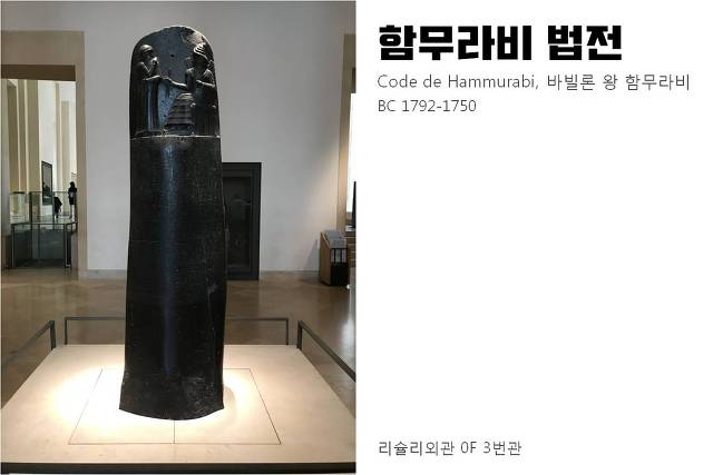 고대 바빌로니아의 법전인 코드 오브 함무라비는 인류 역사상 가장 오래된 법전 중 하나로, 이 유물은 법과 정의의 상징으로 여겨져요. 이 작품은 박물관 내에서 특별한 존경을 받으며 전시되고 있답니다.