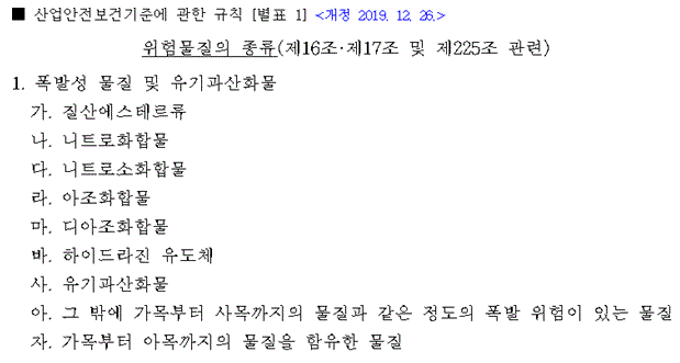 제225조(위험물질 등의 제조 등 작업 시의 조치) 사업주는 별표 1의 위험물질(이하 "위험물"이라 한다)을 제조하거나 취급하는 경우에 폭발ㆍ화재 및 누출을 방지하기 위한 적절한 방호조치를 하지 아니하고 다음 각 호의 행위를 해서는 아니 된다.