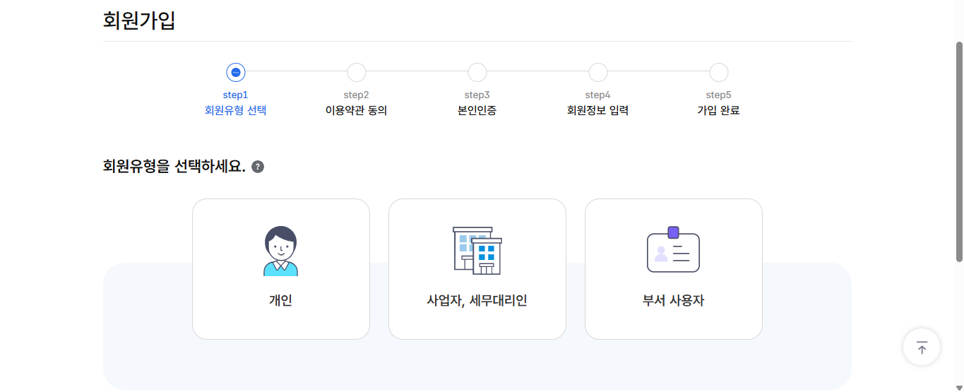 - 개인, 개인사업자, 법인 등 유형 선택