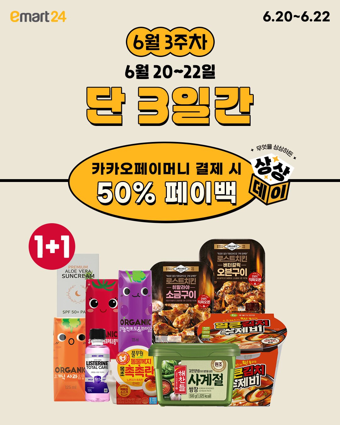 이마트24가 매주 주말 진행하는 상상데이가 6월에도 강력한 할인 혜택으로 돌아왔다. 이번 6월 3주차 상상데이는 6월 20일부터 22일까지 단 3일간 진행되며, 카카오페이머니 결제 시 최대 50% 페이백과 함께 1+1 행사가 적용된다. 일상 필수템부터 간편식, 유기농 음료까지 다양한 품목이 준비되어 있다.