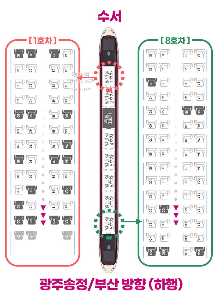서울 수서역에 도착하는 열차의 경우 1호차가 지하철 환승 통로와 가장 가깝다. 환승을 빠르게 하고 싶은 승객이라면 1호차 좌석을 선택하는 것이 유리하다. 짐이 많거나 일정이 촉박한 경우라면 이 환승 동선의 차이가 상당히 크게 느껴진다. 따라서 목적지와 이동 계획에 따라 호차를 현명하게 선택하는 것이 좋다.