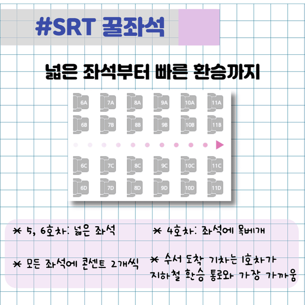 SRT 열차는 기본적인 승차감이 좋지만, 특정 호차와 좌석은 더욱 쾌적함을 제공한다. 먼저 5호차와 6호차는 다른 호차보다 좌석 간격이 넓어 장시간 이동 시 편안하다. 다리를 뻗기 용이해 피로가 덜 쌓이며, 가족이나 아이와 함께 이동하는 승객에게 인기가 높다. 특히 명절 귀성길처럼 오랜 시간이 소요되는 경우라면 넓은 좌석이 큰 장점이 된다.
