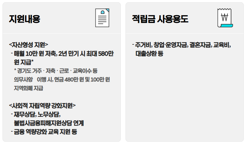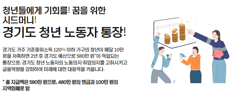 청년 노동자 통장은 경기도에 거주하며 기준중위소득 120% 이하 가구에 속한 청년이 참여할 수 있다. 매달 10만 원을 24개월 동안 저축하면, 경기도의 예산 지원으로 총 580만 원을 마련할 수 있다. 이 중 480만 원은 현금으로, 100만 원은 지역화폐로 지급되어 생활과 미래 준비에 활용 가능하다.