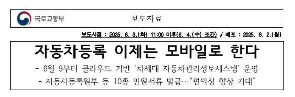 국토교통부는 2025년 6월 9일부터 차세대 자동차관리정보시스템을 정식 운영한다고 발표했다. 이번 시스템 개편으로 자동차 등록, 말소, 원부 발급 등 복잡했던 자동차 민원 업무가 PC뿐 아니라 모바일에서도 간편하게 처리 가능해졌다.
